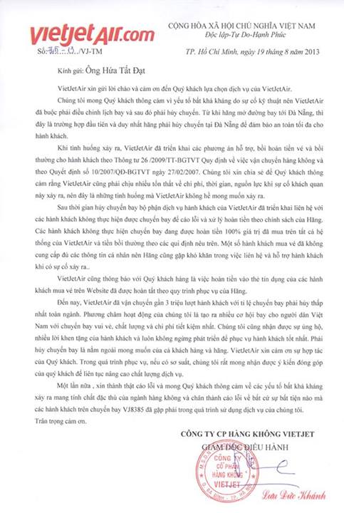 2. Chấp nhận lời xin lỗi chính thức của VJA thông qua công văn số 745-13/VJ-TM, ký ngày 19/08/2013 của Tổng Giám đốc VJA (hình scan đính kèm). Dù rằng, mình hy vọng nhận được bức thư này sớm hơn.