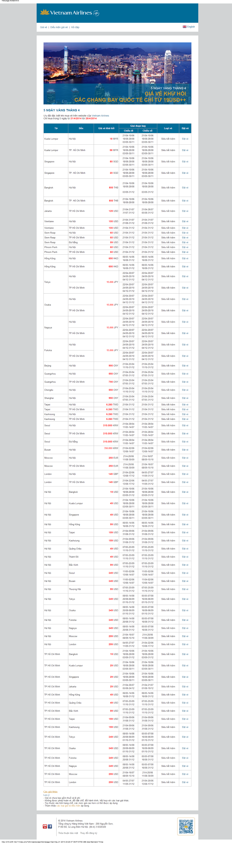 Bà con click xem trong link đó, có đầy đủ giá vé các chặng từ Việt Nam đi quốc tế và thời gian bay áp dụng. Có cả thời gian bay dịp cao điểm hè nhưng chắc số lượng không nhiều. Đây là thời gian học sinh nghỉ hè nên các gia đình đi du lịch rất đông, hãng không cần bán khuyến mãi vẫn kín máy bay mà.
