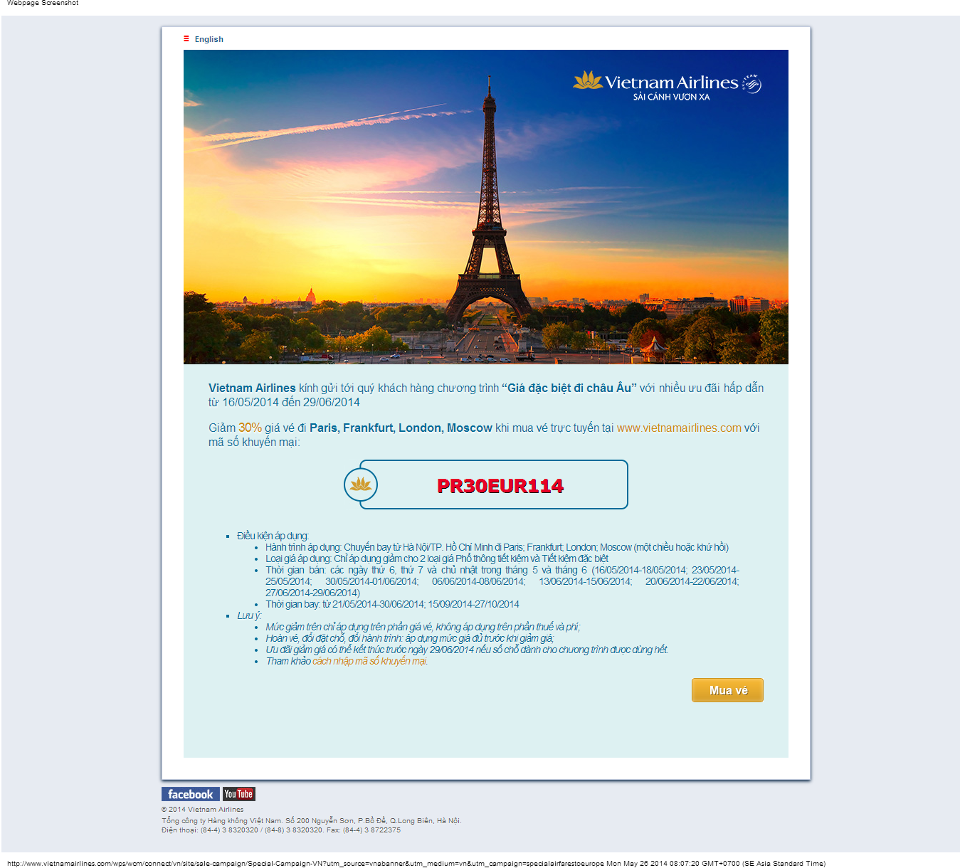 - Giá vé: Giảm 30% giá vé đi Paris, Frankfurt, London, Moscow khi sử dụng Mã khuyến mại.